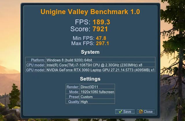Unigine Valley基准测试的得分为189.3fps,而我们测试的80W功率RTX 2060成绩为151fps——RTX 3060领先幅度为25.2%。而之前X10Ti-S的RTX 2070Super成绩也就178fps,也被全新的RTX 3060反超。