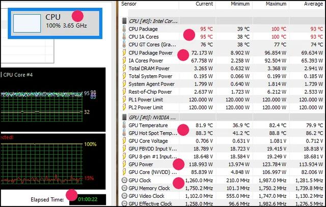 这是双考机1小时的情况(室温23℃)。先提醒大家,钛钽Plus的电竞控制台,默认把处理器的PL1和PL2都设定为75W,如果双考机,处理器封装功率不会超过72W;但如果大家把PL1和PL2都拉到120W,双考时处理器会不时冲上78Wh甚至更高。
