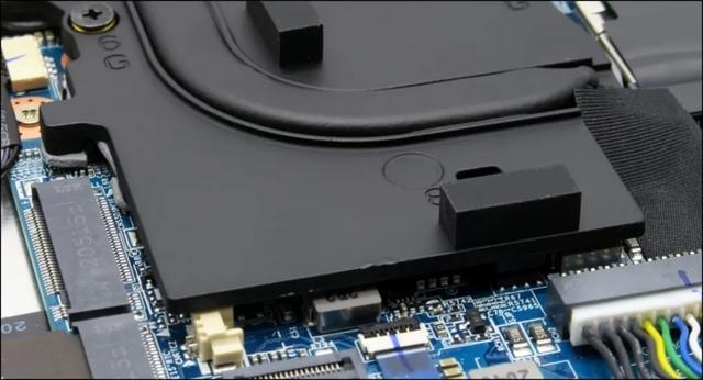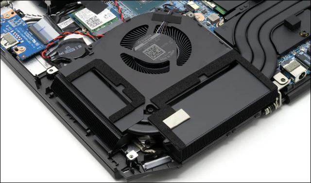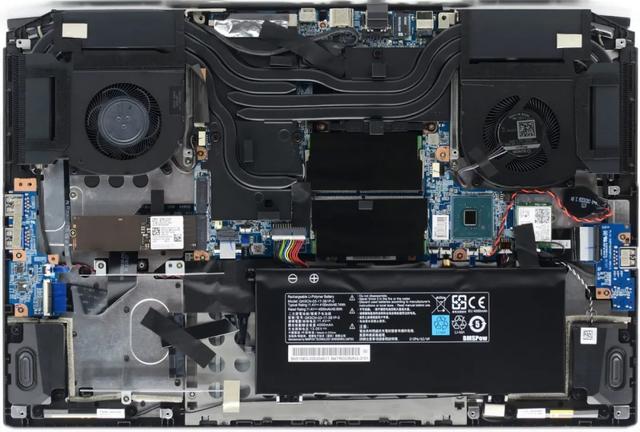 ▲这是钛钽Plus的内部图,五热管,结合面积巨大的散热板(注意该机是17.3英寸机型)。内部有两个M.2 SSD插槽,默认用了一个(测试机为三星PM991 SSD),还能再扩容一根。另外下部还有2.5英寸硬盘位,且预留了数据线和插口,以及2.5英寸硬盘的固定金属板。电池容量不大,46.7Wh,算是结构性存在。