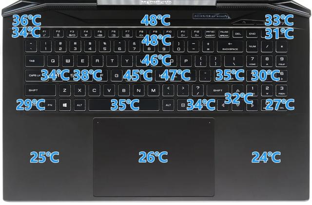 或许大家会被95℃的“高温”吓着,担心该机外壳温度高,但这种担心是多余的,来看看键盘面温度图▼: