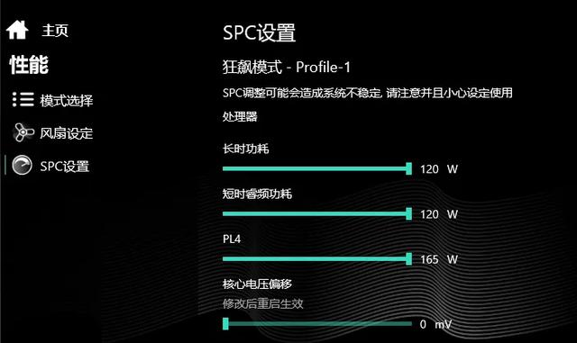 答案是:该机的电竞控制台有SPC设置(超频设置),这里可以看到,钛钽Plus默认的PL2(处理器爆发功率)和PL1(处理器稳定功率)设置都是75W,而且即便是长时负载,温度也很低。而我们通过不断的“加码”尝试,发现PL2和PL1拉满120W也毫无问题——是的,又一台可跑满i7 10875H功率的游戏本出现了!