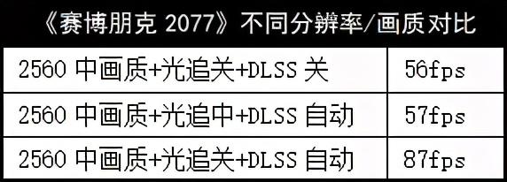最后是公认的画面效果好、硬件优化烂的《赛博朋克2077》,为了“毫不妥协的游戏体验”,我们全程采用2.5K分辨率,并分三种情况进行测试。我们发现,在中等画质,光追关闭和DLSS关闭时,平均帧速为56fps左右;而在光线追踪三项开启,光照中等的情况下,设置DLSS自动,平均帧速基本可“补回来”,平均值依然可达56fps、57fps。