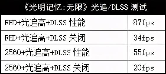 游戏《光明记忆:无限》也是凸显光线追踪效果的典范,而且有单独的Benchmark。在2.5K分辨率下,开启DLSS,可以跑到55fps;而在FHD下,开启DLSS可以跑到87fps,非常流畅。