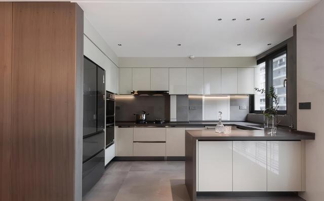 该厨房采用开放式结构,使空间互动更具可能性。在装饰方面,无柄烤漆橱柜,右侧有 U形操作台,左边有电源区域,整体功能很强。