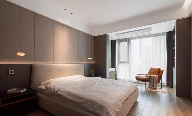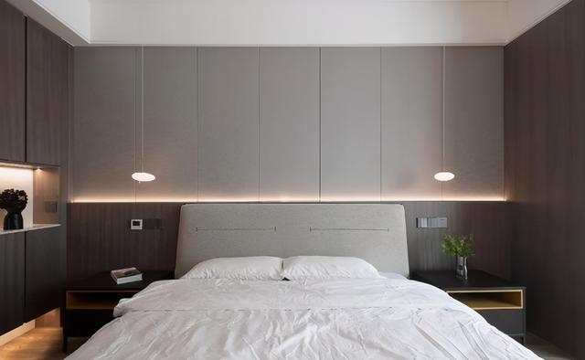床的设计很考究,上部做了灰色硬包,下部加了护墙板,下部加了埋入灯带等,效果超有质感。