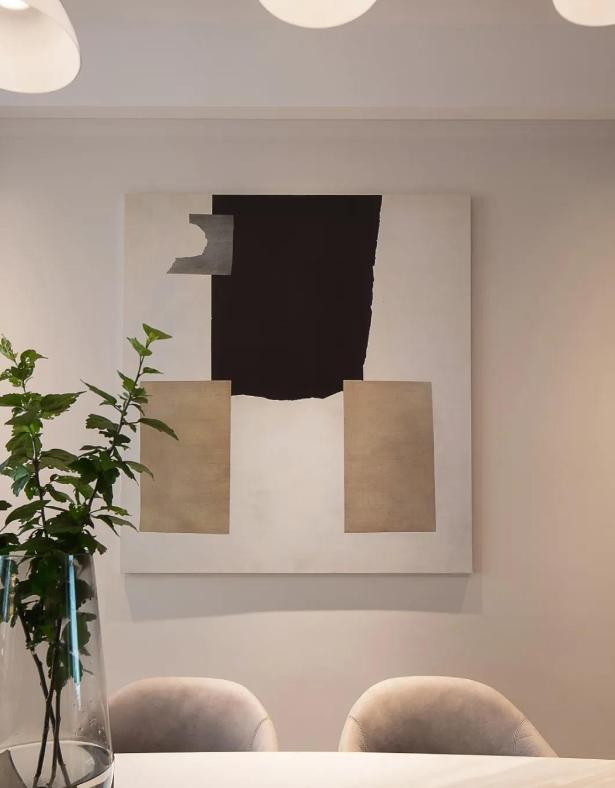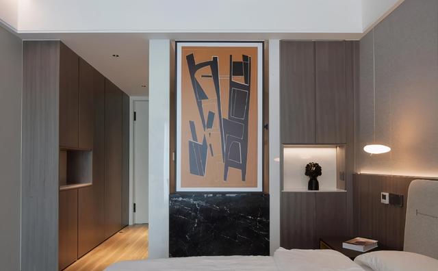 另一边是背景墙,以装饰作用为主,因此将挂画点缀加上黑色元素作为对比,其余为右边的杂物柜,收纳主卧需要使用的生活用品恰到好处。