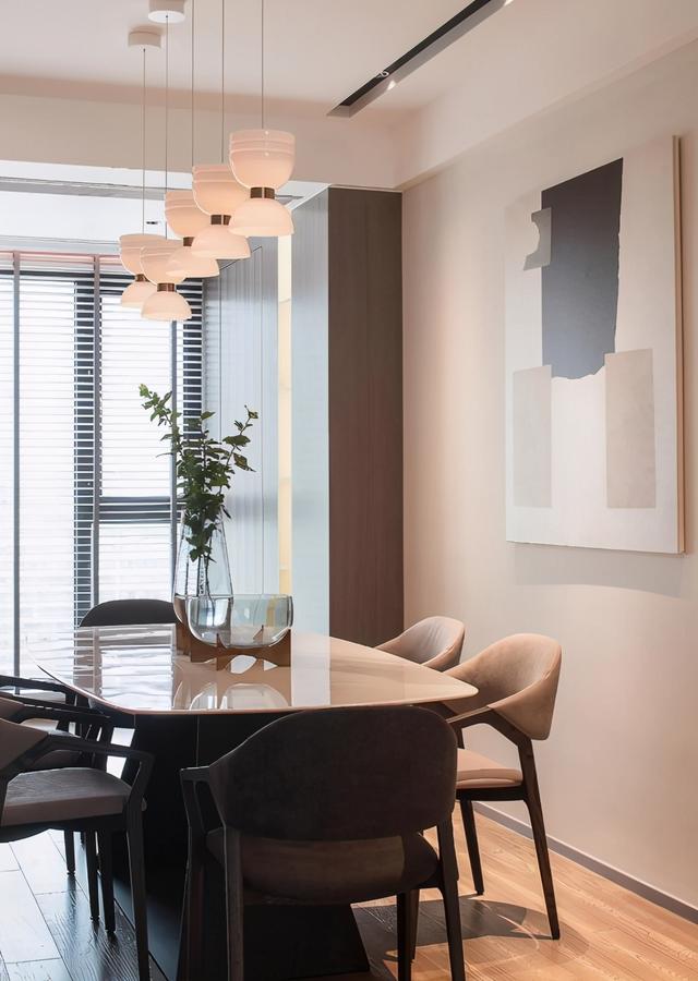 中段为餐椅,以细而薄的白色大理石餐桌为主,搭配简单的灰色椅子,以及黑色的桌角,效果整洁时尚,看起来特别迷人。