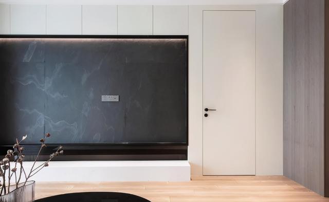 正对着电视墙,做了地台和白色的墙板,加上中间的油墨石板,还有上面嵌入的条纹,效果比仅仅刷油漆更别致。另外一些则是右边的隐形门,色调与周围保持一致以使看上去不突兀。
