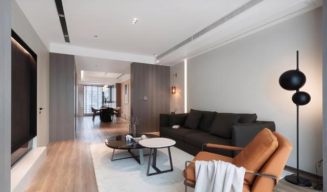 在家具方面,这里以黑色沙发为主,可以用来平衡大面积室内的浅色,当然光是这种对比也不行,在搭配结构轻巧的黑白双拼茶几和橘色座椅等时,视觉效果更饱满的同时,气氛也会显得更加活泼。