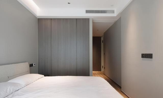 除石膏板吊顶外,背景墙几乎可以用家徒四壁来形容,毕竟没有任何造型和装饰,不过配以柔软舒适的卧室床,整体还是落落大方的。