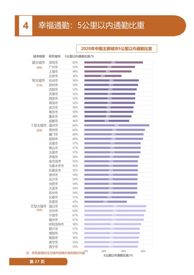 5公里以内通勤比重又称幸福通勤比重,反映可以就近职住、步行骑行通勤的人口占比,是城市宜居性的重要测度。5公里以内通勤比重,徐州为54%。