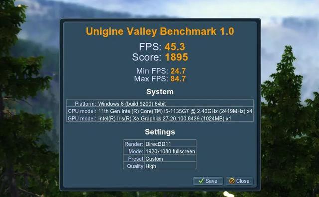 Unigine Valley基准测试45.3fps,成绩接近满血版的MX350。而96EU的Iris Xe在这个项目上超过了满血版的MX350。而只从集显角度来说,IrisXe无论是i5的80EU版还是i7的96EU版,都算是一骑绝尘了!