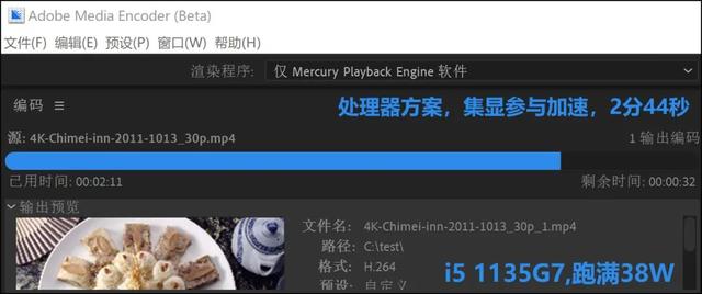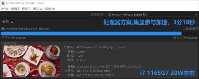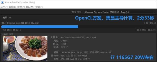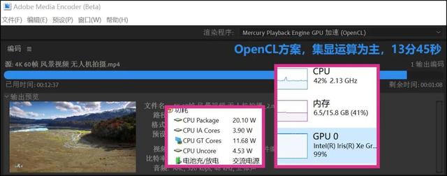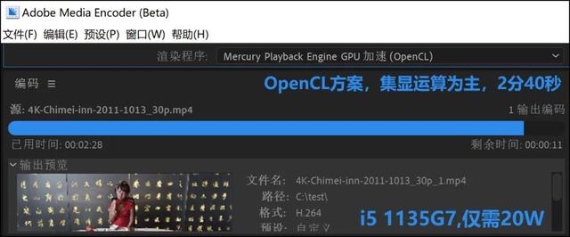 大家知道,以前我们用集显本进行Media Encoder视频转码,都使用“仅Mercury Playback Engine软件”方案,也就是处理器方案,这时集显只是“参与解码”,起到辅助作用,主要计算依然靠CPU。为什么不选集显主导的OpenCL方案呢?那是因为之前无论英特尔的UHD系列还是Iris Plus系列,以及其他平台的集显,OpenCL方案都明显慢于处理器方案!