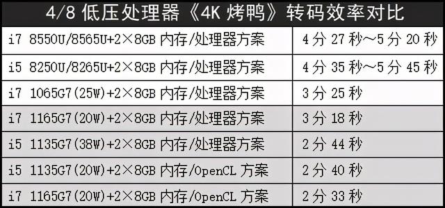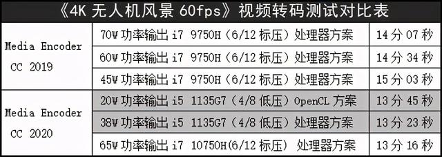 ▲测试结果很惊人!Tiger Lake i5-1135G7在OpenCL方案下,整体封装功率20W,总耗时13分45秒;而用处理器方案,38W封装功率,成绩反超了OpenCL方案,13分23秒(看来38W/3.82GHz的稳定输出疯狂啊)。而这两个成绩,都掀翻了从45W到70W功率释放的6/12第九代酷睿i7-9750H标压处理器(即便考虑转码软件的升级因素,也是具备优势的)。只有65W功率输出的第十代酷睿i7-10750H标压处理器才能略胜这颗i5-1135G7——但请注意它们的功率差异有多大!另外可以很明显地分析出:如果是功率释放高的i7-1165G7,肯定可以掀翻65W的i7-10750H!