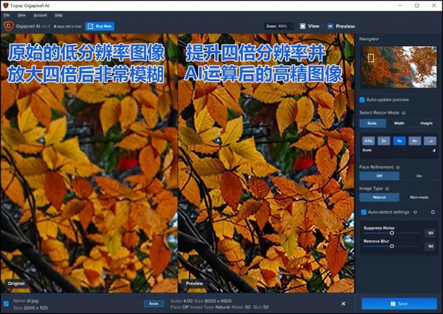 Gigapixel AI可将图片最高放大6倍分辨率,并通过AI计算重塑6倍放大图像的细节。我们用一张2000×1125分辨率的红叶照片放大到400%(8000×4500分辨率),并通过本机的AI运算得到极为清晰的图像!