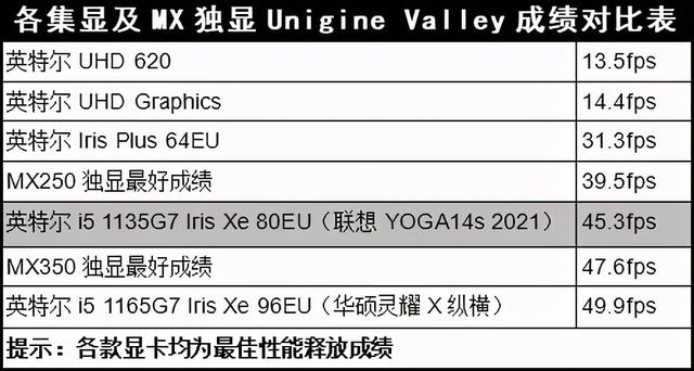 那么,i5-1135G7和i7-1165G7的Iris Xe性能,和其他轻薄本的显卡相比处于什么水平呢?下面的Unigine Valley对比测试可以告诉你答案▼:
