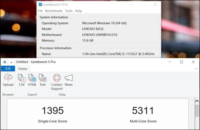 正因为有很高的频率,加之YOGA 14s 2021的“高功率释放”(高至38W,让该处理器性能彻底释放),这颗Tiger Lake i5- 1135G7的单核性能非常夸张,Geekbench 5 Pro的单核得分达到了1395分,而其他移动处理器的单核得分多在1000分~1150分,这颗i5处理器优势相当明显,是目前我们测试过的移动处理器中最高的得分(也大幅超过了之前测试的灵耀X纵横的i7-1165G7(高至30W)的单核成绩)。