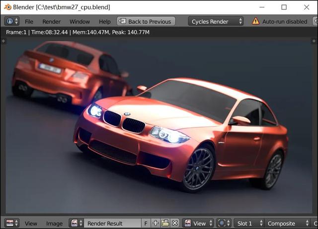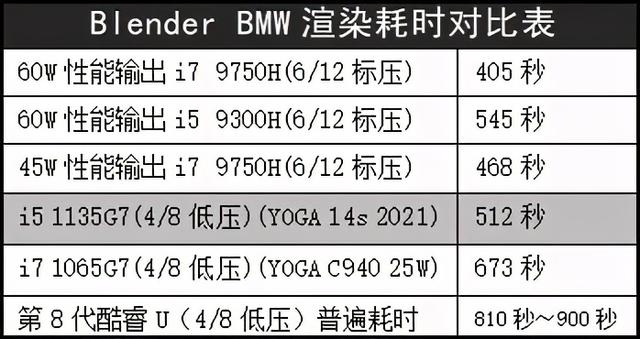 的确,按照常理来说,即便是简单的3D渲染,那也是6核标压及以上规格移动处理器才能去碰的应用,4核的低压处理器最好别做尝试。以3D建模/渲染应用Blender的单帧渲染为例(官方提供的BMW样本),之前我们测试过大量第8代酷睿4核8线程低压处理器,耗时多在13分钟以上。那么,YOGA 14s 2021的i5-1135G7处理器放进去,会是什么情况呢?