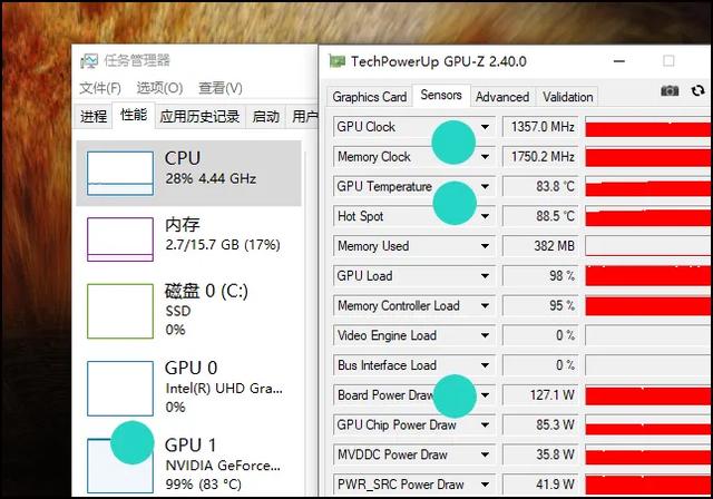 ▲RTX 3060显卡单考,功率125~127W,很不错,也是市售主流游戏本的第一梯队表现。核心频率1370MHz左右(实际玩游戏时会高得多),温度83.8℃,热点最高温度为88.5℃——这在游戏本的显卡温度中不算低,但并没有什么问题。
