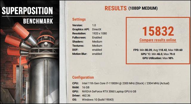 ▲Unigine2 Superposition基准测试,默认的FHD中等画质,得分15832分,已经超过了RTX 2070的最好成绩(15400分)。而130W的RTX 3060得分最高为16000分出头,相差无几,都是RTX 3060显卡中的第一梯队。
