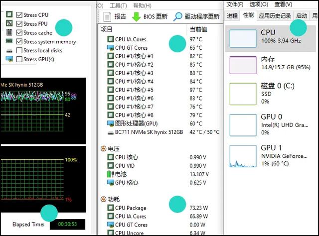▲室温25℃,处理器单负载考30分钟,封装功率在70W~73W小幅波动,全核频率3.94GHz左右(注意,实际应用时频率会更高,甚至可跑满全核4.2GHz)。处理器内部温度,不同核心在77℃到99℃波动,偶现100℃(瞬间值)。横向比对,G15的处理器功率表现算第一梯队的,内部温度的最高值虽不算低,但实际应用温度并不高。