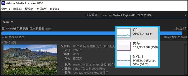 ▲Media Encoder视频转码测试,CUDA方案,RTX 3060主导计算,处理器辅助计算,耗时仅5分10秒,也是该项目测试中极好的成绩。