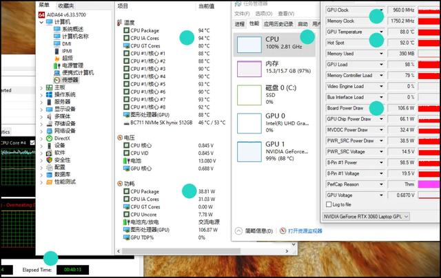 ▲双考机初期处理器功率很高,72W,而后缓降,2分钟左右都还维持60W+。4分钟左右还有45W。不过最终是36W~40W波动(也就稳定了),全核频率3.9GHz左右波动,温度方面,不同核心在87℃~95℃波动,比单考时反而还降低一点。RTX 3060独显功率在103W~117W波动,温度88℃左右,热点92℃,频率在1000Mhz左右波动(实际游戏高得多)。