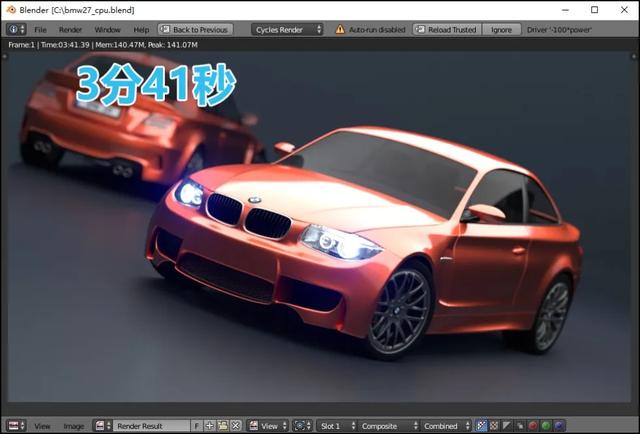 ▲Blender是另一个时下流行的3D建模和渲染软件。在老的2.79b版本上,大家熟悉的BMW轿车渲染,耗时3分41秒,打破了由钛钽Plus创下的3分48秒的纪录,创下该测试项成绩的新高。
