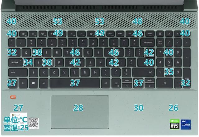 ▲双考机40分钟后的C面温度图。主要高热区域是C面中上部,但键盘区域中,即便是高热区域,上手也毫无问题,只是带有通风口的机身顶部区域摸起来有些烫。而大型3D游戏的主操控按键WASD只有34℃~38℃,没有明显热感。腕托区域和触控板也是凉爽的。总体来说,外壳温度表现没问题。