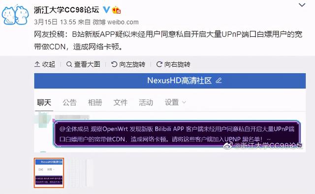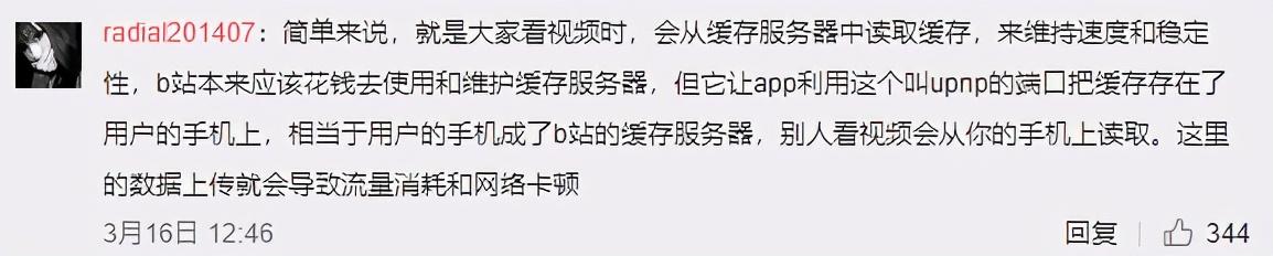 还有网友解释称,简单来说,就是大家看视频时,会从缓存服务器中读取缓存,来维持速度和稳定性,b站本来应该花钱去使用和维护缓存服务器,但它让App利用这个叫upnp的端口把缓存存在了用户的手机上,相当于用户的手机成了b站的缓存服务器,别人看视频会从你的手机上读取。这里的数据上传就会导致流量消耗和网络卡顿。