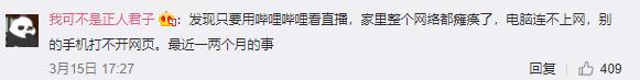 对此,有网友表示,发现只要用哔哩哔哩看直播,家里整个网络都瘫痪了,电脑连不上网,别的手机打不开网页。最近一两个月的事。