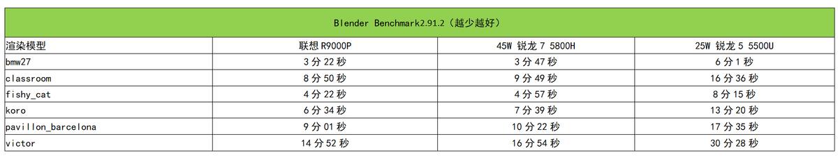 ▲再来一个更大压力的重度负载测试,Blender Benchmark六个场景连续渲染,软件版本选择为2.91.2,由于场景数量较多,所以该测试即便是对于8核处理器来说也需要四五十分钟,足以考察处理器满载时的运行情况。最终六个场景里,R9000P各自的耗时截图如上所示。同时,下表中牛叔加入了跑45W的锐龙7 5800H作为对比,以此观察同一颗处理器满载时,在不同功率下的效率表现。而从测试来看,显然,77W+的锐龙7 5800H的确比45W款的满载效率更高,测试时间越长,领先越明显!