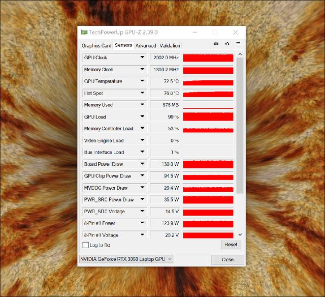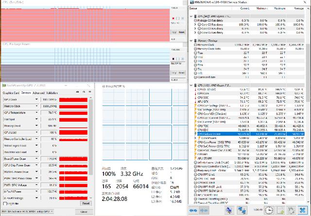 从双考机来看,R9000P满载时的表现非常猛。处理器依然处于超标性能释放状态,而独显功率则达到了115W左右,频率也高,并且双核心的状态非常稳定。