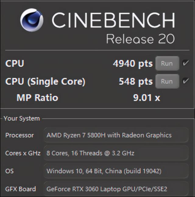 ▲Cinebench R20测试,R9000P的锐龙7 5800H多核成绩为4940pts,单核548pts,作为参考,上一代爆发状态为73W的锐龙7 4800H多核是4470pts,单核是490pts。该项测试中,锐龙7 5800H的多核提升为10%,单核提升为11%。