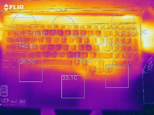 键盘区域热量堆积在回车键和屏幕下方区域,回车键附近最高在 50℃左右,W、S按键区域约40℃,碗托区域凉爽。风扇噪声方面,野兽模式下风扇噪声比较明显,但谈不上特别吵闹——比一些“起飞了”的机型要安静一些:键盘上方为50dBA,用户位大概为43dBA。