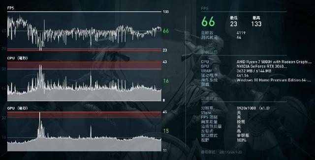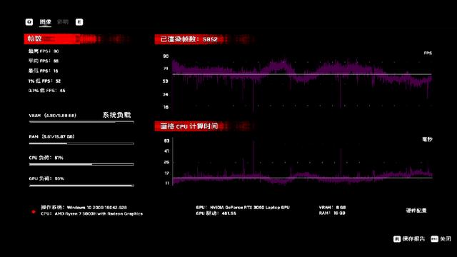 ▲《赛博朋克2077》,R9000P在2K下超级画质+DLSS质量设定,平均帧数50fps,可玩。此外,从图中可以看到,锐龙7 5800H跑30W左右就能搞定游戏了,而RTX 3060跑到了123W,核心频率都很高。