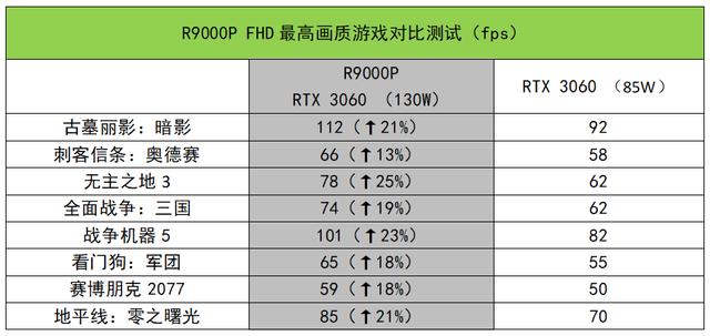 在FHD游戏对比实测中,R9000P搭载130W款的RTX 3060相对85W款有很明显的领先,绝大部分游戏领先幅度为20%左右,最大为25%,最低为13%,和图形基准性能测试比较相符。同时大家也可以看到,R9000P在FHD最高画质下轻松搞定3A大作,即便是优化较差的《赛博朋克2077》,R9000P的FHD平均帧速也能达到59fps,流畅度不错。
