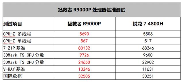 在处理器基准性能上,R9000P的锐龙7 5800H完全超越了爆发73W的锐龙7 4800H(基准测试时间较短,对于8核16线程处理器,更侧重爆发状态的性能),部分测试压力相对较大的项目如CineBench、V-RAY、国际象棋等多核性能领先幅度明显,并且单核性能效率增强。