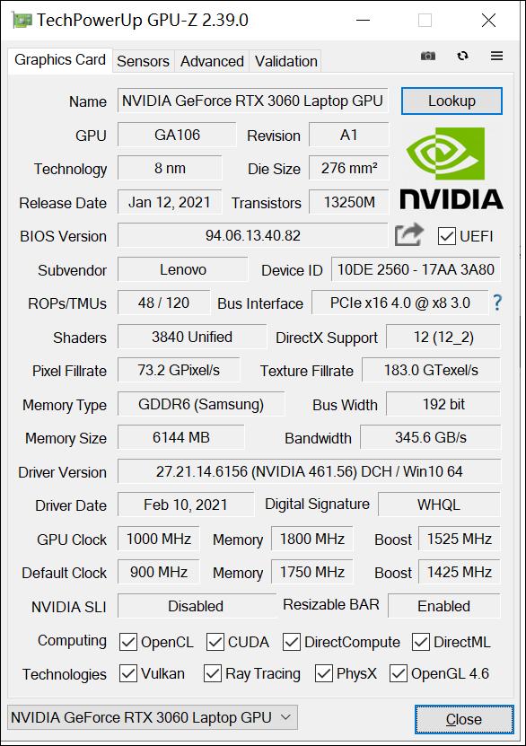 牛叔体验款R9000P搭载的独显为GeForce RTX 3060 Laptop GPU,是NVIDIA发布的RTX 30系移动平台里的甜品型号。其采用了NVIDIA最新的Ampere架构,带来了更高效的第二代RT Core和第三代Tensor Core,还提供包括Dynamic Boost 2.0、WhisperMode 2.0、NVIDIA DLSS以及Resizable BAR等了多项功能。