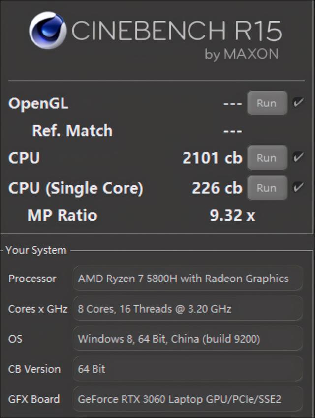 ▲大家熟悉的Cinebench R15,R9000P的锐龙7 5800H的多核得分是2101cb的——又一款突破了2100cb的猛机。作为参考,上一代锐龙7 4800H的多核成绩在1900cb左右,该项测试中锐龙7 5800H多核性能提升幅度约为10 %。另外,锐龙7 5800H的单核成绩达到了226cb,而锐龙7 4800H则为187cb,单核性能提升幅度达到了20%以上。