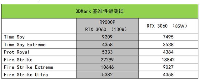 当然,大家最关心的还是它的具体功率:而这一点也是R9000P的一大核心卖点,它搭载的就是RTX 3060里的最高功率款130W版本!并且支持独显直连。下面我们来看看130W款RTX 3060+独显直连相比普通85W款RTX 3060,其性能究竟提升几何(测试环境:野兽模式+独显直连模式)。