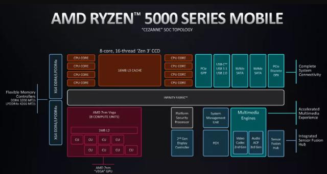 由于采用了与表现优异的桌面平台相同的7nm ZEN3架构,锐龙5000移动版带来了诸多升级亮点:1,从ZEN2架构升级到了ZEN3架构,锐龙5000系列处理器带来了历史性的单核提升,游戏性能大幅增强;2,高速缓存翻倍。由于锐龙5000移动版采用了统一的8核心CCX架构,8个核心可以共享提升到16MB的三级缓存,带来了更强的多线程性能表现;3,更高的频率。由于对7nm工艺的运用越来越成熟,锐龙5000移动版可以做到更高的工作频率,从而提升性能、降低数据延迟。4,能效比更高。同样,由于对7nm工艺的把控更加精湛,锐龙5000移动版的能效比进一步提升,功耗控制更加出色。