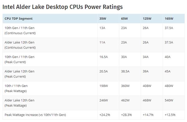 根据Intel提供的电源供电规范,12代酷睿热设计功耗将有165W、125W、65W、35W四个级别,相比现在的10/11代增加了更高的165W档次。