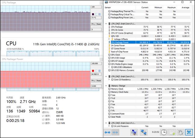 室温25℃左右,利用AIDA64对处理器进行单考FPU测试。该机在前30分钟可以持续65W的性能释放。而在30分钟以后,i5 11400处理器的功率则会运行在55W~65W之间,核心温度在72℃附近。