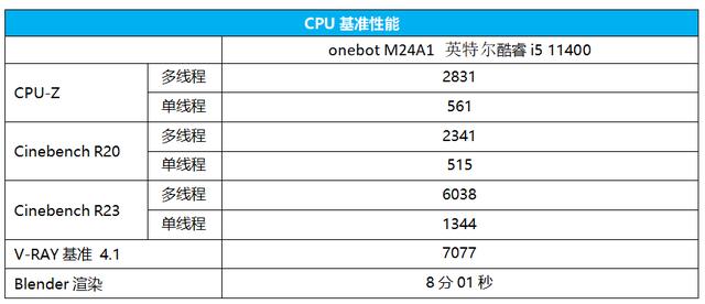 从以上基准性能测试成绩来看,onebot M24A1的性能释放属于标准的65W款i5 11400表现,例如在Cinebench R20测试中,该机的多核分数为2341pts,单核分数为515pts;在Cinebench R23测试中,其多核分数为6038pts,单核分数为1344pts,轻松胜任日常商务办公应用。值得一提的是,onebot M24A1的单核性能表现不错,这点在办公应用中比较重要。