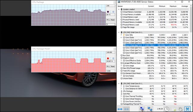 同时我们还加入了负载相对较高的blender BMW渲染测试,从测试过程来看,i5 11400处理器运行在44W~65W之间。当处理器运行在44W时,6个核心频率基本稳定在2.6GHz默认频率附近;而当处理器运行在65W时,部分核心跑到了4GHz左右,部分则较低。由此可见,应对常规办公应用而言,非满载时,onebot M24A1所搭载的i5 11400处理器可以跑较高的功率和频率。