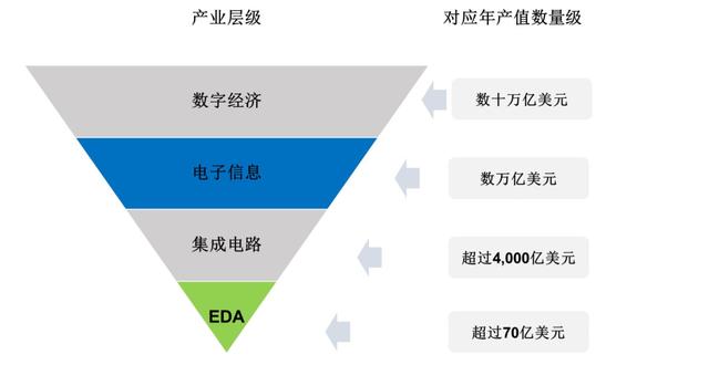 2020 年全球 EDA 市场规模虽仅超过 70 亿美元,却支撑起 4000 亿美元的集成电路产业, 支撑着数十万亿规模的数字经济。一旦 EDA 出现问题,包括集成电路设计在内的全球集成电路产业必将受到重大影响,由 EDA 工具、集成电路、电子系统、数字经济等构成的倒金字塔产业链结构稳定将面临严峻挑战。