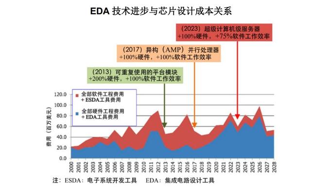 EDA工具的发展创新能很好地平抑芯片设计成本,提高芯片设计效率。EDA 工具的技术进步和应用推广,能够推动芯片设计成本保持在合理范围。据UCSD教授Andrew的推测,2011 年一款消费级应用处理器芯片的设计成本约 4000 万美元,如果不考虑 1993-2009 年 EDA 技术进步,相关设计成本可能高达 77 亿美元,EDA 让设计成本降低近 200 倍。同时,可重复使用的平台模块、异构并行处理器的应用、基于先进封装集成技术的芯粒技术等驱动设计效率不断提升,缩短设计周期,减少设计偏差,提高流片成功率。