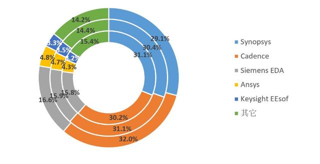 2020 年,新思科技(Synopsys)、楷登电子(Cadence)与西门子 EDA(原 Mentor Graphics) 作为目前仅有的拥有设计全流程 EDA 工具解决方案的企业,集中了全球超 77%的 EDA 工具市场。其他企业缺少布局设计全流程工具技术的综合实力,在各自擅长的 领域开发面向特定流程或个别环节的工具瓜分剩余市场份额,Ansys 凭借热分析、压 电分析等优势点工具,Keysight EEsof 凭借电磁仿真、射频综合等优势点工具,获得 市场第四、第五的位置。
