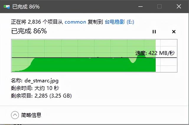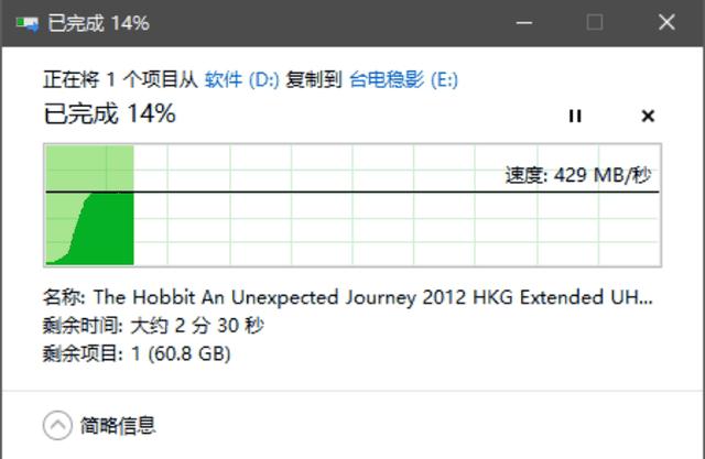 实际应用中,我们首先复制了一部容量为71GB的电影文件,用时165秒,平均写入速度430MB/s,接下来我们选择了《CS:GO》的游戏客户端,总大小25GB/s,小文件比较多,将它复制进稳影512GB,一共用时79秒,平均写入速度316MB/s,不管是大文件还是小文件拷贝的速度都比较不错,至少比HDD强不少。